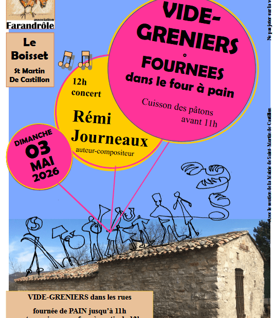 L’association Farandrôle vous propose sa traditionnele fête du printemps au four à pain du Boisset. Vide grenier, cuisson du pain, musique gourmandises et convivialité seront au rendez-vous… Venez nombreux !